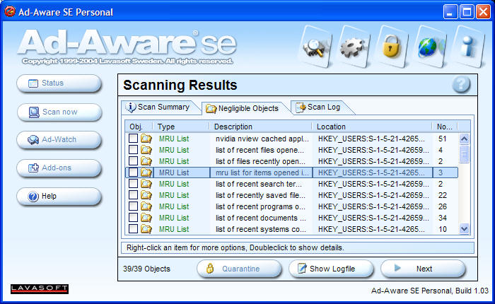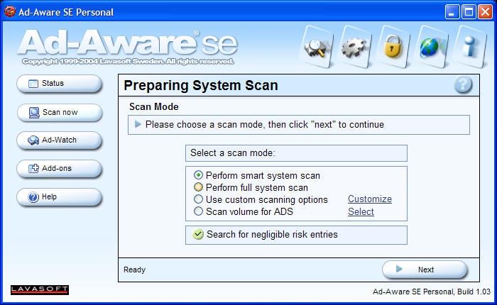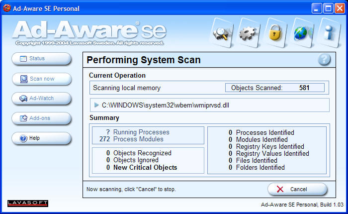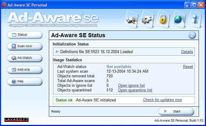 That's it. You're done with this program. You also should check for updates again every 30 days. Now it's time to install Ad-Aware. Ad-Aware actually will remove the spyware already on your system, while SpywareBlaster just prevents new spyware from being installed. Ad-Aware will prompt you to update itself when you first run it. Do this immediately. It will also ask you on occasion when you run it again. You should run it every 30 days or so.