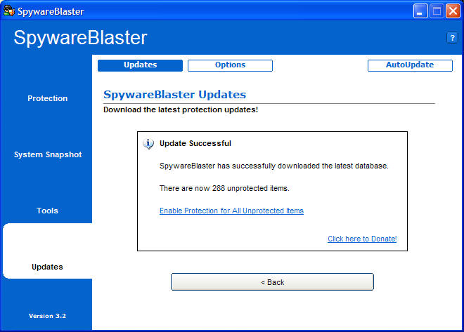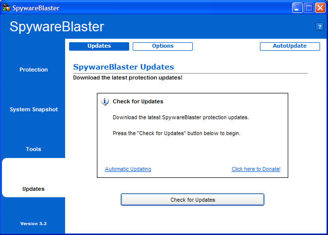 Well, at least Microsoft put in a dialog box that prompts you before you install software using ActiveX. Most people, however, will just blindly click "yes" and proceed to install the spyware. Note that if you see this security warning, it does not necessarily mean that a web site is trying to install spyware on your computer. Windows Update, for example, displays this message. Now it's time to download Spyware Blaster. Spyware Blaster is an immunization program. It runs in the background, like a virus scanner, and does its best to prevent spyware from being installed. Installation is pretty easy. When you run it for the first time, it tells you exactly what to do (click "enable protection on all items.") One thing it doesn't tell you to do is update it. Do this by clicking the "Updates" tab: