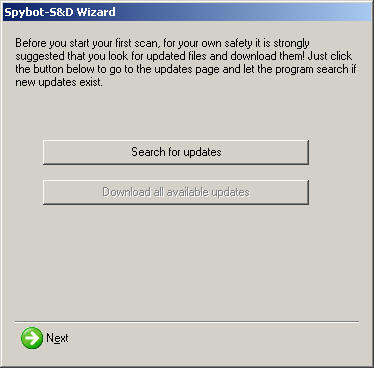 Click Next to remove the spyware. (Ad-Aware will make a backup for you.) Most of your spyware will now be gone. But Ad-Aware doesn't catch everything, so it's time to install Spybot. After installing Spybot, the Wizard will come up. When you get to the screen below, click "Search for updates" and then "Download all available updates."